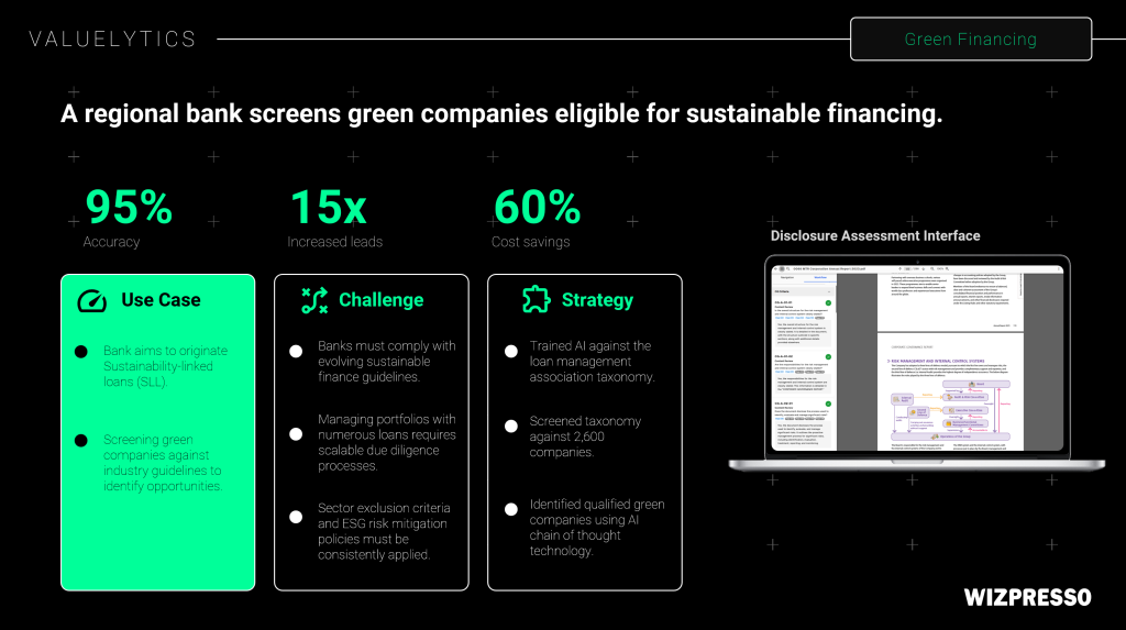 Traditionally, credit and relationship managers must manually review company reports, ESG disclosures, and industry data to determine whether a borrower qualifies for green or sustainability-linked loans. This involves: