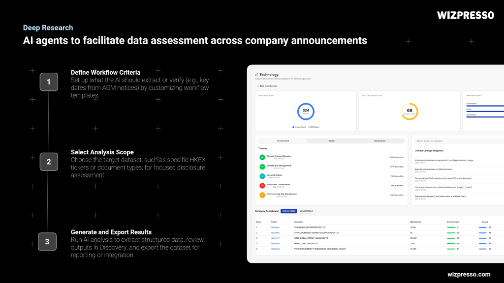 Wizpresso Discovery is an AI-powered platform that enables banks and financial institutions to systematically identify green financing prospects across the HKEX 2,500 universe of listed companies. It streamlines the due diligence process by automatically extracting, categorizing, and analyzing ESG and segment-level data directly from annual reports and sustainability disclosures.